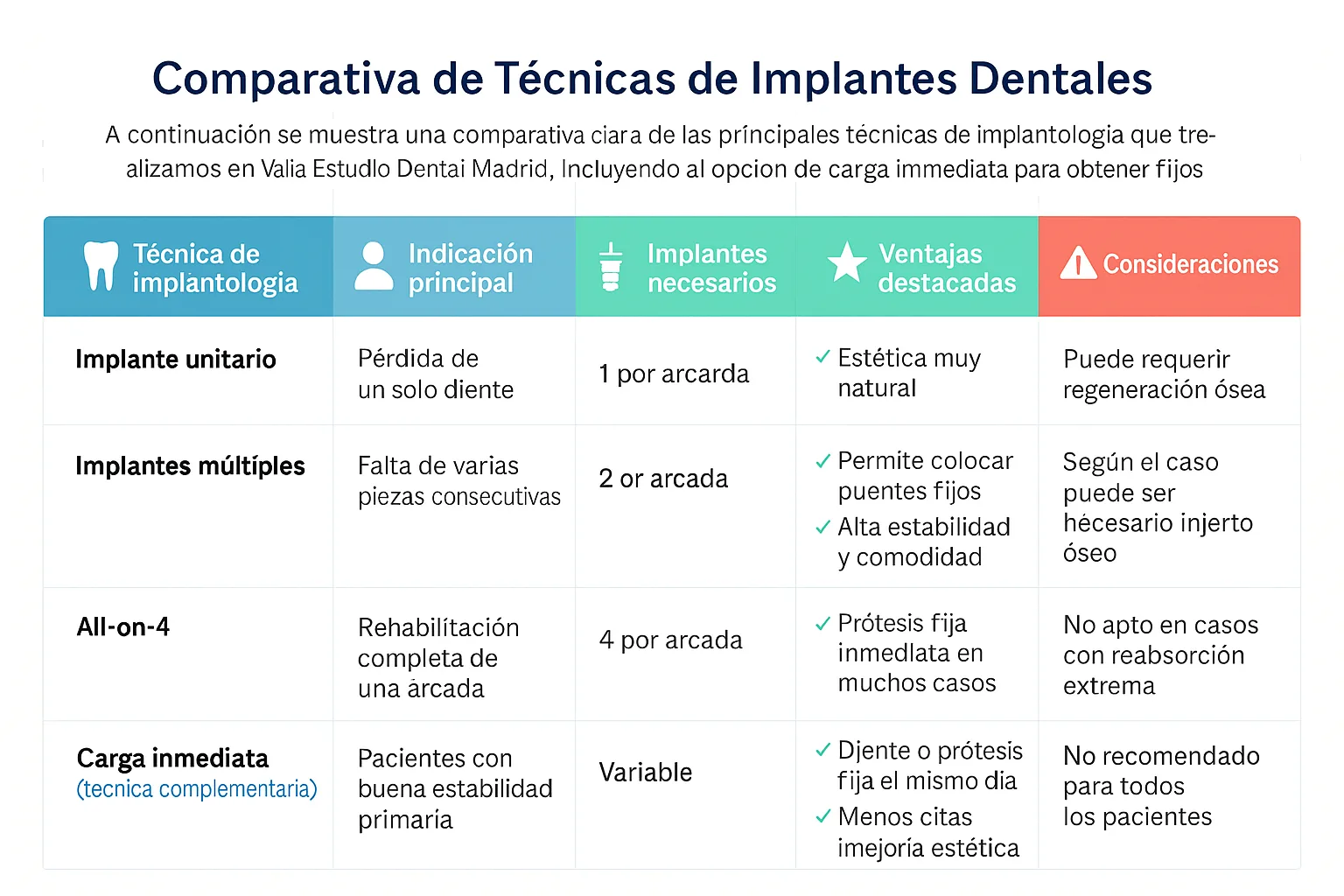 En Valia Estudio Dental Madrid ofrecemos diferentes técnicas de implantología que se adaptan a cada situación: desde la sustitución de un solo diente hasta rehabilitaciones completas de toda la arcada. Para ayudarte a entender mejor las opciones disponibles, hemos preparado una comparativa visual con las características, ventajas y consideraciones de cada tratamiento.